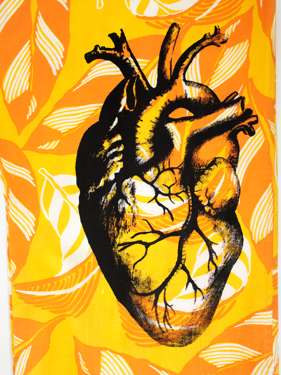 E nas costas, um toque especial — um coração em silk screen manual, impresso à mão, para lembrar que o amor também se veste.